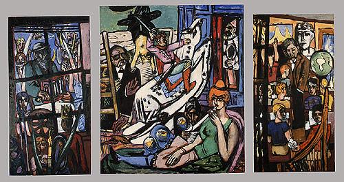 Oil on canvas Born in Leipzig, Germany, Max Beckmann enrolled at the Weimar Academy of Arts in 1899 and between 1903 and 1904 traveled to Paris, Geneva, and Florence. Before the age of thirty, he was successful as an artist and financially secure. His paintings of the time, inspired by Impressionism, attracted clients, and he exhibited widely in Europe during the teens and 1920s. Following World War I his work changed dramatically in reaction to the horrors he had seen. At first, he focused on biblical scenes, but during the 1920s he realized more contemporary allegories and painted devastatingly realistic portraits and figure paintings that were associated with the Neue Sachlichkeit (New Realism) group, with whom he exhibited in 1925 but never formally joined. He saw the world as a tragedy of man's inhumanity to man and saw life as a carnival of human folly. His work remained intense and allegorical throughout his life, but after the mid-1920s his style of painting changed to include Expressionistic brushwork and brighter colors. With the rise to power of the National Socialist regime in Germany, Beckmann and his work came under attack. In 1933 he was dismissed from his teaching position at the Academy in Frankfurt, and in 1937 his paintings were included in a Nazi-sponsored exhibition of "degenerate art." Beckmann fled Germany via Amsterdam for the United States, where he died thirteen years later. The theme that connects the three panels of "Beginning," the most autobiographical of Beckmann's ten triptychs, is a childhood dream. The central panel shows a playroom where a little boy in military costume brandishes a sword as he mightily rides a rocking horse. His Puss 'n Boots doll hangs upside down behind him, presumably slayed by his weapon. The noise he makes has alarmed his parents (seen at the left near the ladder), who have climbed up to inspect his attic kingdom. More prominently placed is the figure of a redheaded woman who reclines seductively, blowing blue bubbles from a pipe. Squeezed between the boy and his fantasy is an old grandmother reading a newspaper. To the left and right, on separate panels, Beckmann painted other memories from his childhood — a hurdy-gurdy grinder and a classroom with teacher and students. | |||||||||
